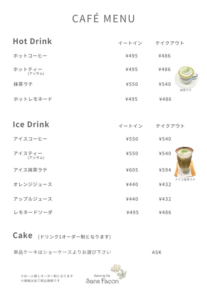 ◾️ドリンクおよびケーキのみのご提供(ケーキはショーケースよりお好きなものをお選びいただけます)