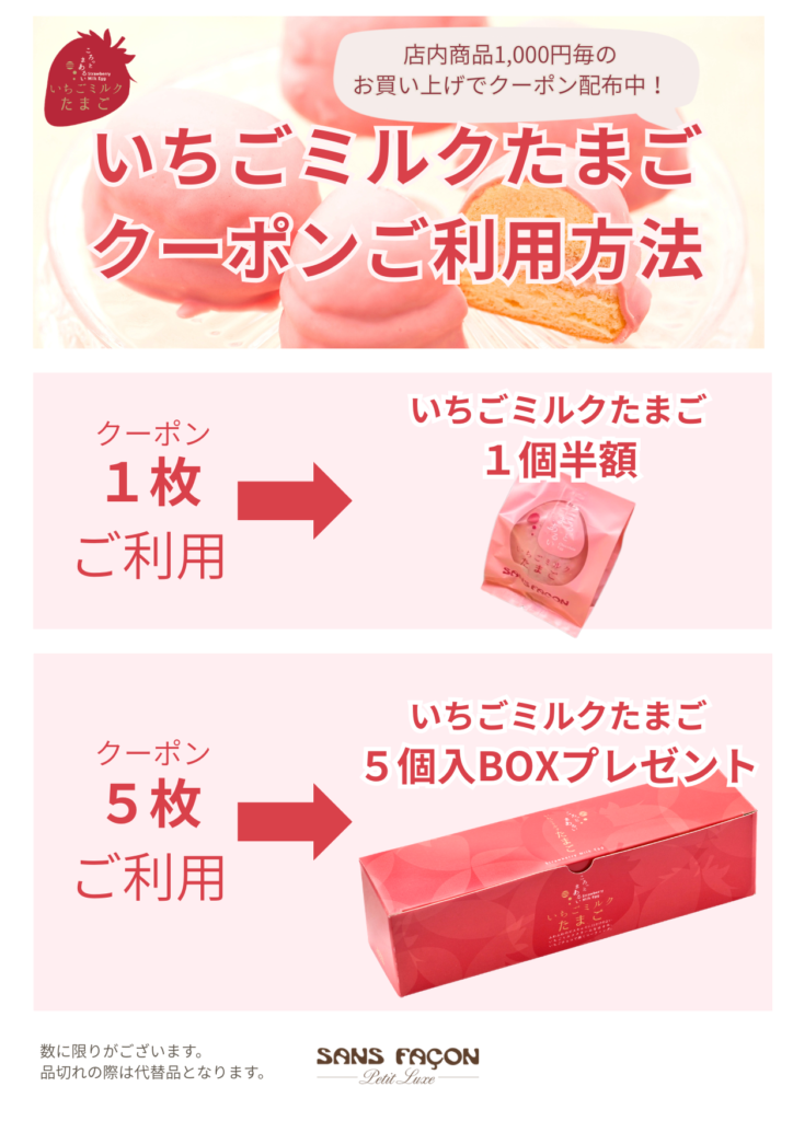 3/6(金)からいちごミルクたまご販売&クーポン配布!